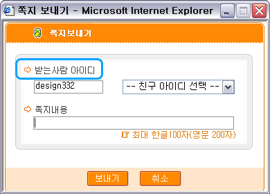 Ä£±¸ÀÇ ¸¶ÀÌȨÇÇ¿¡¼ ÂÊÁö¹ß¼ÛÀ» ÇÒ °æ¿ì, Ä£±¸ÀÇ ¾ÆÀ̵𰡠±âº»À¸·Î Ç¥½Ã°¡ µÇ¸ç ´Ù¸¥ Ä£±¸¿¡°Ô º¸³»°í ½ÍÀº °æ¿ì´Â µî·ÏµÈ Ä£±¸¸®½ºÆ®¿¡¼ ¼±ÅÃÇϰųª, Á÷Á¢ ¾ÆÀ̵𸦠ÀÔ·ÂÇÏ¿© º¸³»½Ç ¼ö ÀÖ½À´Ï´Ù. |